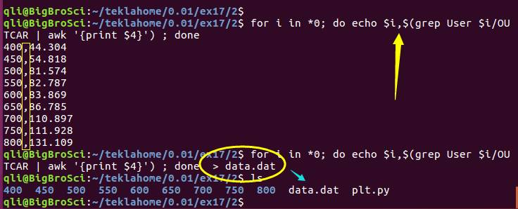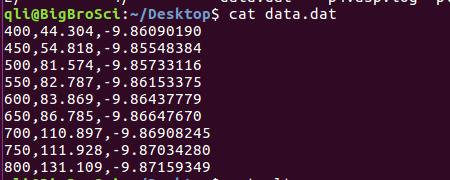 前面的命令中, “\t” 改为 逗号, done 后面 加上 > data.dat, 重新运行一遍。