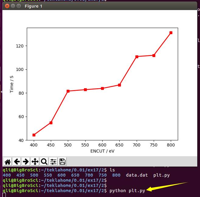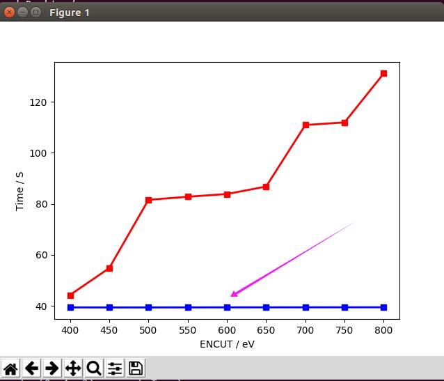 从图中可以看出,计算时间随着ENCUT的增加也相应地增加了。因此,在保证计算准确度和ENCUT的值的选取,你要学会合理取值,加快自己的计算速度。此外,图表的比较形象直观,大家在今后的学习中,多多思考将自己的数据转化为图表的形式!可以很好的表达自己的计算结果。