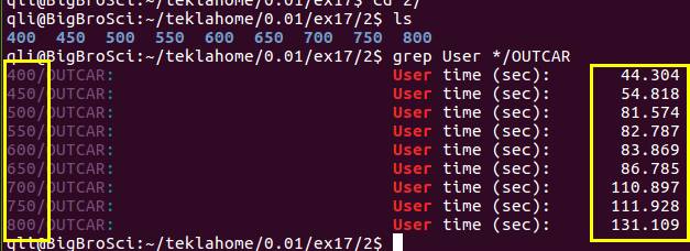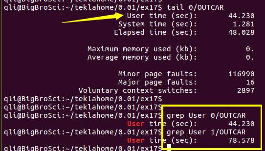 注意:grep User OUTCAR 后得出的结果被空格分成了4部分,时间信息在第4部分里面。User(1) time(2) (sec:)(3) 44.20 (4)