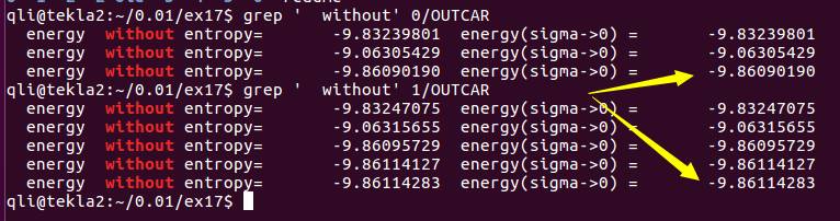 在这里,我们要认真思考收敛标准对于我们计算体系能量的影响,选取一个合适的标准而又不会浪费太多的机时。一般来说,结构优化的时候,EDIFF=1E-5, EDIFFG =-0.01至 -0.03 都是被认可的。