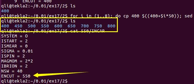 1 | for i in {1..8}; do cp 400 $((400+$i*50)); sed -i "s/400/$((400+$i*50))/g" $((400+$i*50))/INCAR ; done |