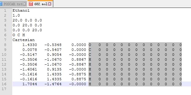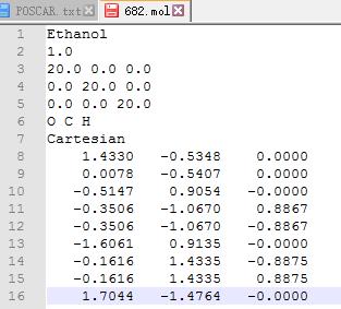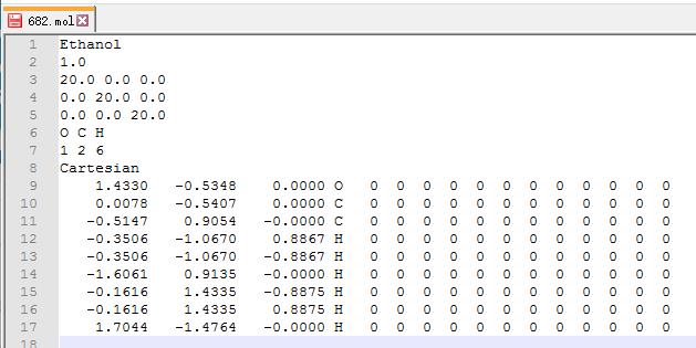 我们的模型是把乙醇分子放到一个 $ 20 \times 20 \times 20~A^3 $ 的格子里面。输入完之后,坐标后面的元素符号以及那些 $0$ $0$ $0$ 可以删掉,也可以不管。