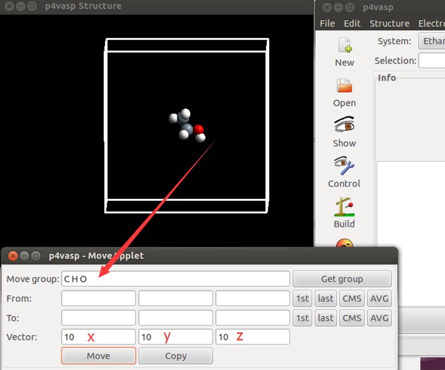 Move group 是你要移动的原子,这里大师兄直接输入了 C H O 三个元素符号(中间有空格)表示选择所有元素的原子。然后在 Vector 中选择 $x, y, z$ 三个方向上移动的大小。你也可以写 $1$ $1$ $1$,然后点击 Move 按钮 $10$ 次。