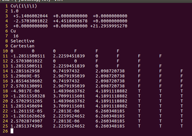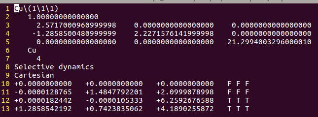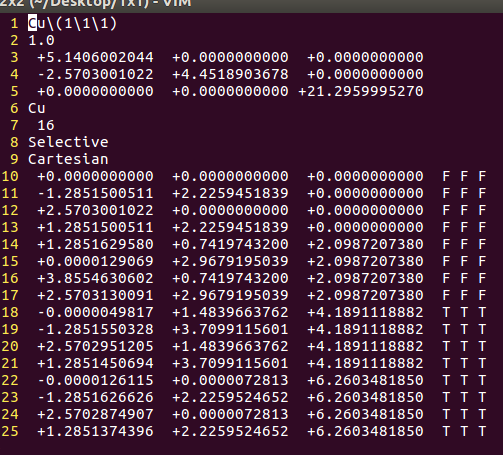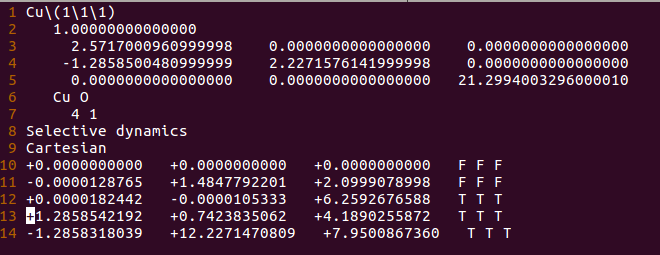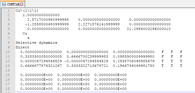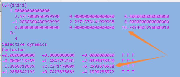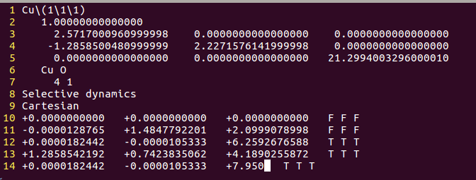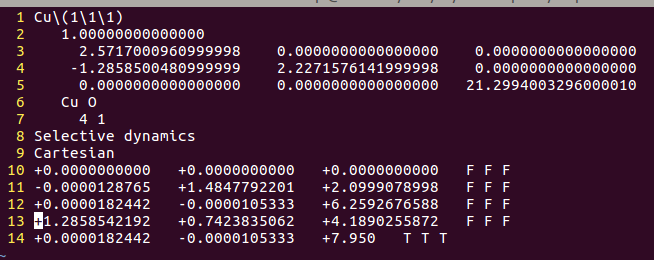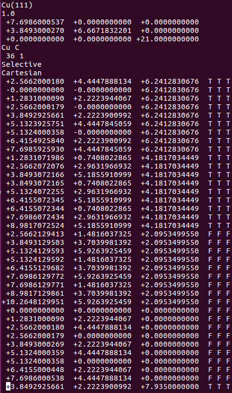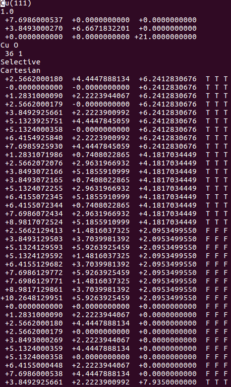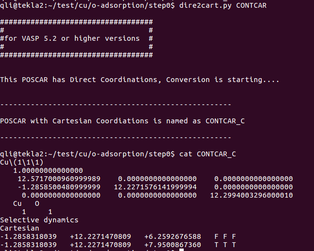 通过sed命令批量操作在H原子的吸附上,只能完成一半的任务,也就是把元素行中的C或者O改成H。而另一半的任务:坐标的修改,则需要大家自己手动操作一下(记得在Cartesian坐标下修改,如果你脑子转的很快,可以迅速将Direct转化为Cartesian的话,也可以直接编辑Direct坐标)。