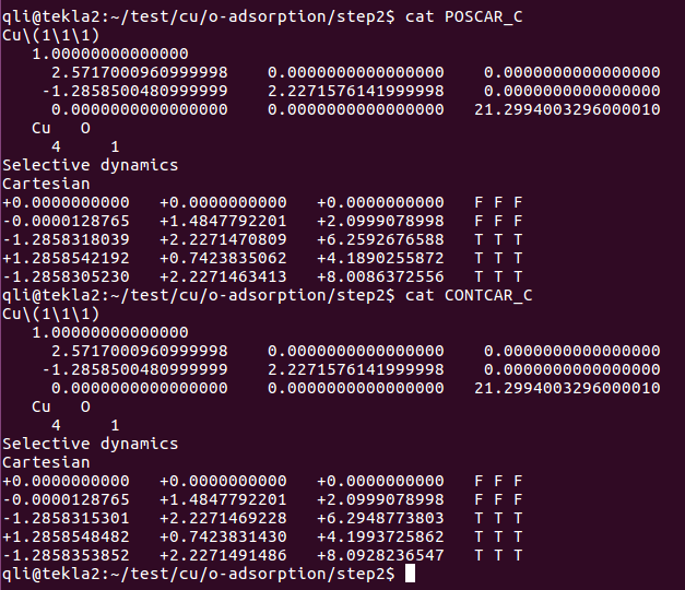 当你发现了这些不同之处,就应该差不多明白了,这是2个计算任务文件,一个是C原子在Cu(111), 另一个是O原子在Cu(111)上的计算。